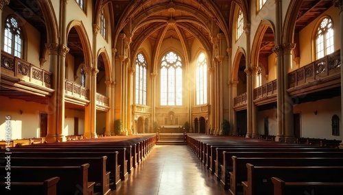 Fototapeta premium A majestic church choir loft, bathed in sunlight, showcasing ornate architecture and empty pews , interior, altar