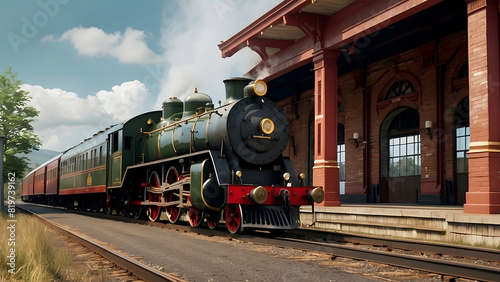 Naklejka premium A majestic classic steam locomotive pulls into a vintage station, evoking a...