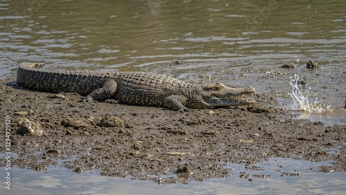 Naklejka premium A majestic crocodile sunbathing on a muddy riverbank blending seamlessly with...
