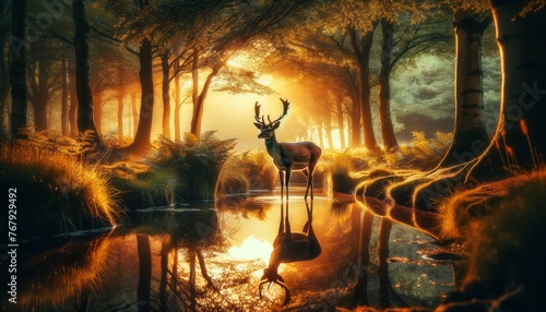 © FantasyLand86, Obraz premium A majestic deer standing in a shallow pond during sunset, with the golden light reflecting off the water.
