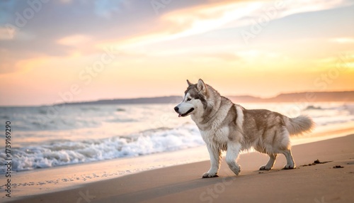 Fototapeta premium A majestic dog walks along the wet sand of a beach, framed by the warm light of a setting sun. Gentle waves lap the shoreline