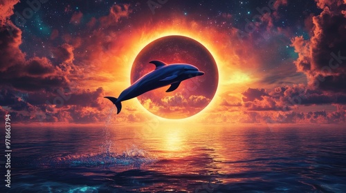 Naklejka premium A majestic dolphin leaps from the ocean against a vibrant, surreal sunset with an eclipse-like glowing orb in the sky.
