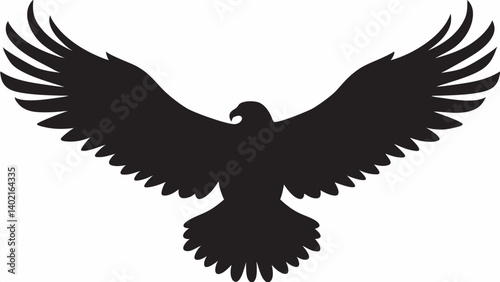 © Samina, Obraz premium A majestic eagle in powerful flight, soaring high above with intense black silhouette against a stark white background.