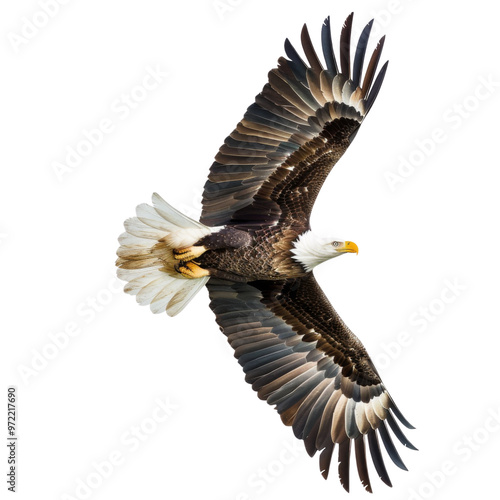 © PoyTumStudio, Obraz premium A majestic eagle soaring gracefully above, showcasing its powerful wings and sharp features in stunning detail.