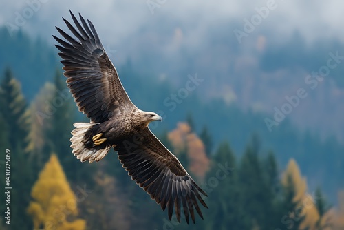 Fototapeta premium A majestic eagle soaring over a beautiful forest landscape, wings spread wide...