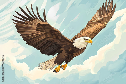 © Noufaldi, Obraz premium A majestic eagle soaring through a bright sky with clouds.