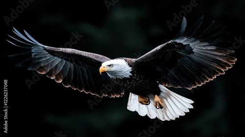 © Alma, Obraz premium A majestic eagle soaring through the air with outstretched wings against a dark background.