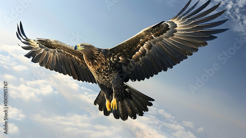 Fototapeta premium A majestic eagle soars through a bright sky, showcasing its powerful wings...