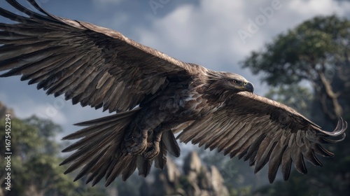 © Haza, Obraz premium A majestic eagle soars through a dramatic, misty landscape.