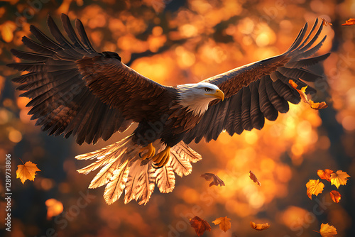 © Noufaldi, Fototapeta premium A majestic eagle soars through an autumn landscape filled with falling leaves.