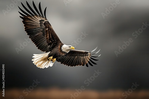 Fototapeta premium A majestic eagle soars through the sky, showcasing its powerful wings and striking plumage against a dramatic, blurred background.
