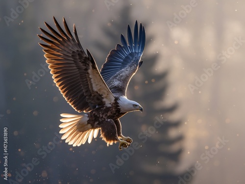 Obraz premium A majestic eagle with striking feathers soars gracefully through the golden morning light.
