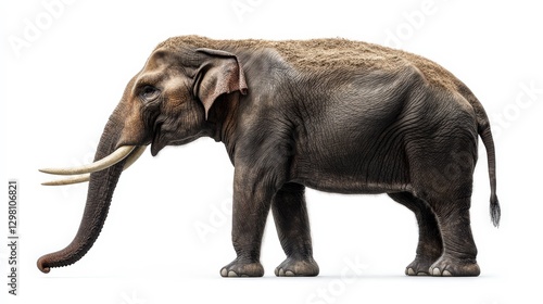 © AiPhotoSale, Fototapeta premium A majestic elephant faces left, its robust form cloaked in earthy mud. The distinctive trunk arches gracefully while powerful tusks catch the light