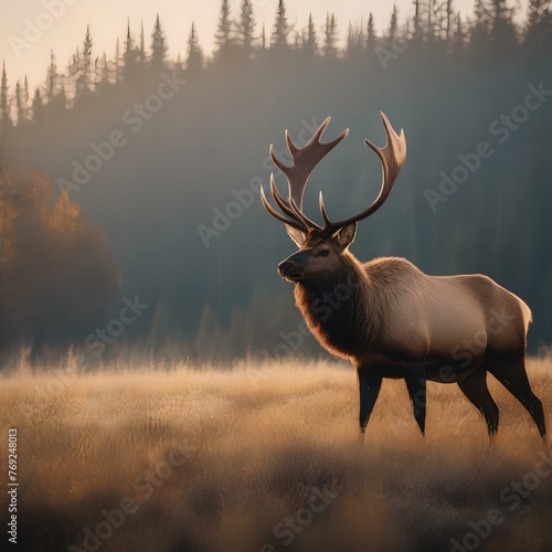 Obraz premium A majestic elk standing in a clearing, with a forest in the background2