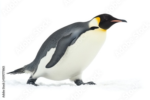 Naklejka premium A Majestic Emperor Penguin Walking Gracefully on Snow, Showcasing Its Unique Black and White Plumage and Vibrant Yellow Accents in a Cold Arctic Environment on white background