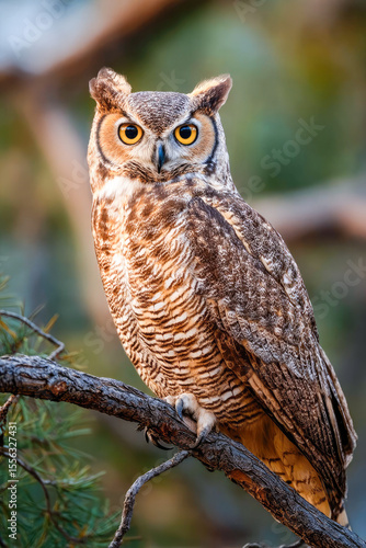 Obraz premium A majestic Eurasian eagle-owl perched on a tree branch surrounded by vibrant...