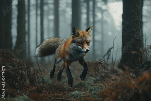 Fototapeta premium A Majestic Fox Leaps Through the Misty Forest, Capturing the Spirit of...