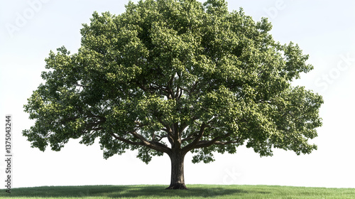 © Supriyono, Fototapeta premium A majestic, full, green deciduous tree stands alone on a grassy knoll against a clear sky . AI generative
