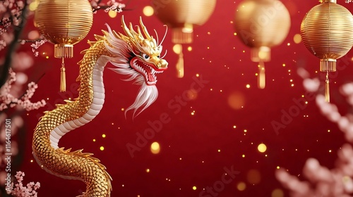 Obraz premium A majestic golden Chinese dragon surrounded by cherry blossoms and glowing lanterns, set against a rich red background with festive golden light accents