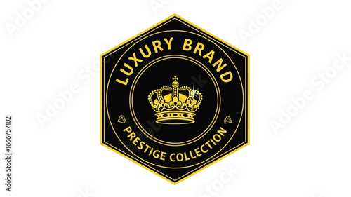 Obraz premium A majestic golden crown emblem set within an elegant black and gold hexagonal frame, symbolizing opulence, prestige, and exclusivity in a sophisticated graphic design