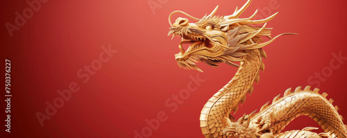 Obraz premium A majestic golden dragon, intricately detailed, commands attention against a vibrant red background, offering ample copy space for captivating designs or messages.