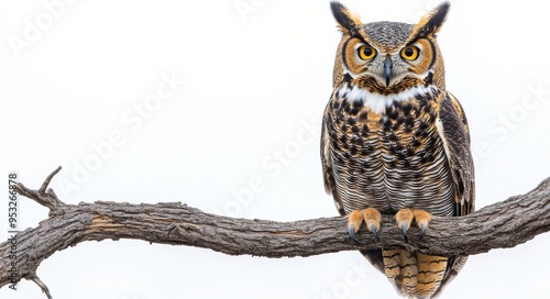Obraz premium A majestic great horned owl perched on a branch against a clear sky during...