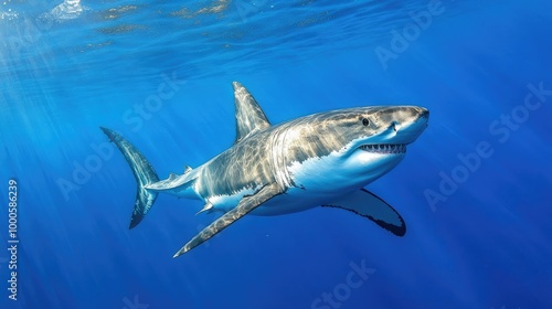 © Boonnam Burart, Fototapeta premium A majestic great white shark swimming gracefully through crystal-clear blue waters, showcasing its powerful physique.