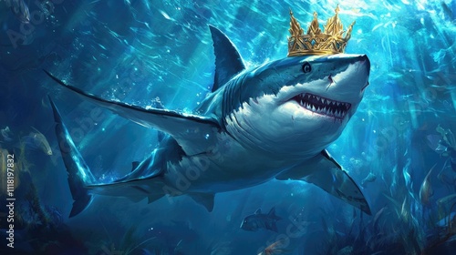 © savittree, Naklejka premium A majestic great white shark swimming gracefully underwater, wearing a golden crown, surrounded by shimmering blue light