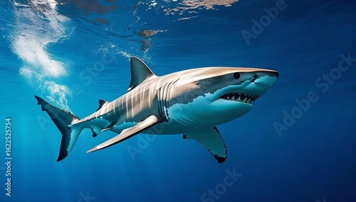Fototapeta premium A majestic great white shark swims gracefully in deep, clear cobalt blue ocean waters.