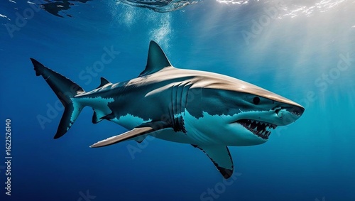 Fototapeta premium A majestic great white shark swims gracefully in deep, clear cobalt blue ocean waters.