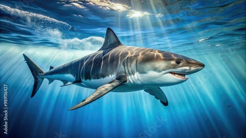 Fototapeta premium A majestic great white shark swims in crystal-clear tropical waters, its...