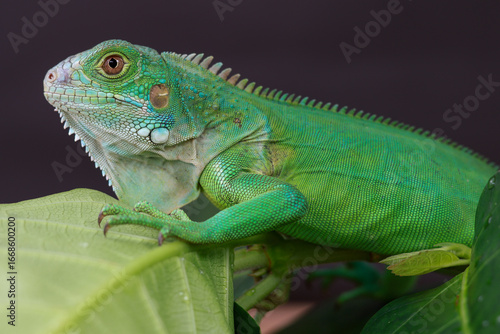 © Jumain, Fototapeta premium A majestic green iguana is captured in profile, perched on a large leaf, with its vibrant scales and powerful stance highlighted against a dark background.