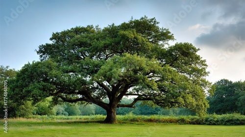 © Anna, Fototapeta premium A majestic green tree, surrounded by lush greenery in a tranquil field