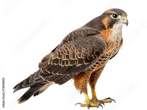 © marimalina, Naklejka premium A majestic hawk stands proudly with its sharp talons ready, showcasing its beautifully patterned feathers and keen expression in a bright, natural light against a white background