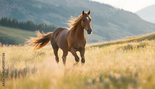 © Ytnart, Fototapeta premium A majestic horse gallops through a sunlit meadow, showcasing its beauty and power amidst a serene landscape.