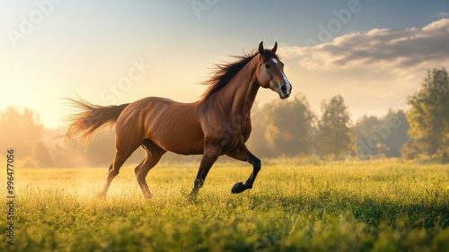 Fototapeta premium A majestic horse running freely in a sunlit field.
