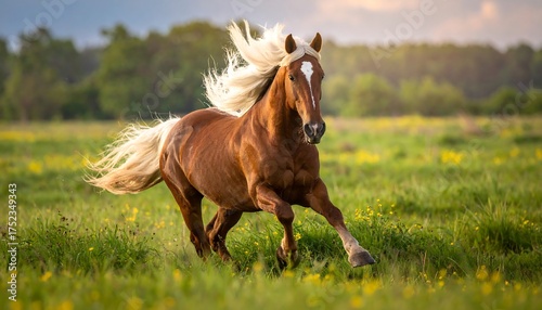 © majur, Obraz premium A majestic horse with a flowing blonde mane charges across a grassy meadow dotted with yellow wildflowers. The sun shines brightly in the background