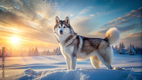© A.Rod, Naklejka premium A majestic husky stands tall, a proud silhouette against the breathtaking backdrop of a winter sunset, its eyes reflecting the golden hues of the sky.