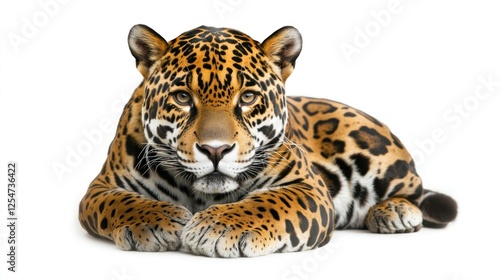 © Jersco, Fototapeta premium A majestic jaguar in a front-facing pose, showcasing its powerful stance, striking spots, and intense gaze, isolated on a white background