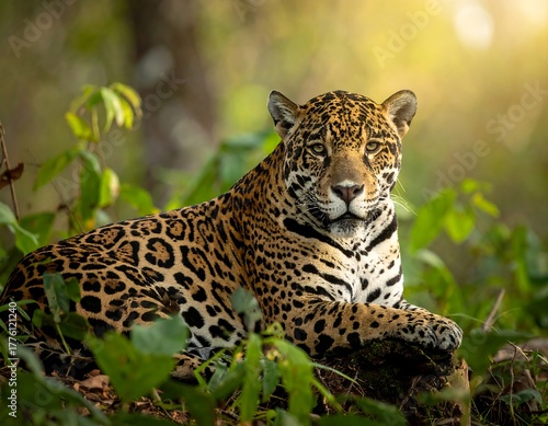 © iso, Fototapeta premium A majestic jaguar resting, looking at the viewer amidst lush green foliage
