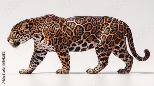 © yasiryasir, Fototapeta premium A majestic jaguar strides across a stark white backdrop, its powerful build and intricate coat showcased in profile. The lighting highlights the details of its spots and muscular physique
