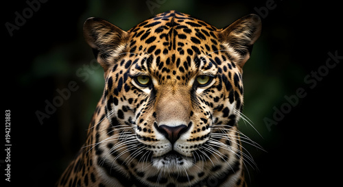 © imranahmed, Obraz premium A majestic leopard gazing intensely into the camera lens with a dark background.