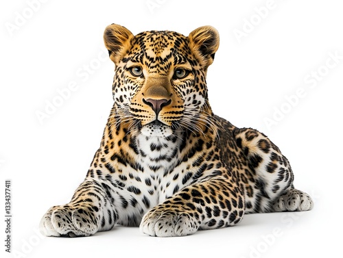 Fototapeta premium A majestic leopard rests calmly on a white background showcasing its stunning...