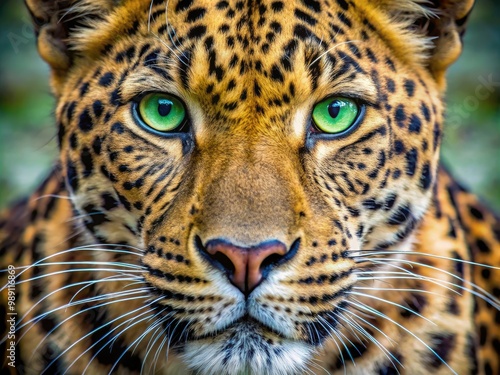 Obraz premium A majestic leopard's face fills the frame, piercing green eyes and whiskers...