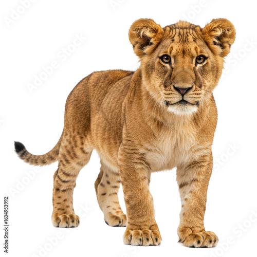 Obraz premium A majestic lion cub with piercing eyes is captured in a beautiful pose.