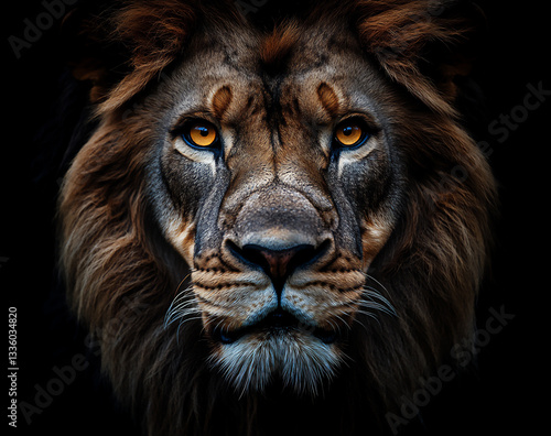 Fototapeta premium a majestic lion, its eyes glowing in the darkness,