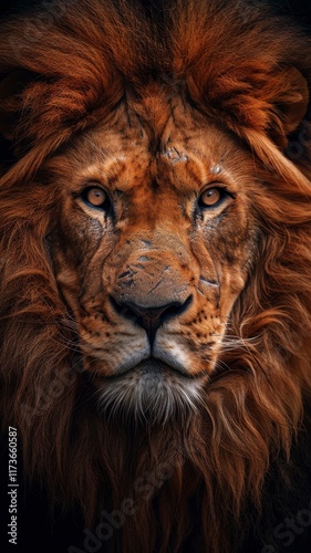© DigitalArt, Fototapeta premium A majestic lion's face with a thick mane, exuding power and intensity against a dark background.