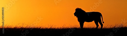 © Rere_Art151, Obraz premium A majestic lion silhouette stands against a golden evening sky