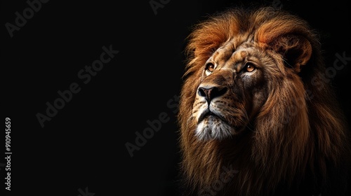 © KhaizanGraphic, Fototapeta premium A majestic lion with a golden mane looking up into the darkness with copy space