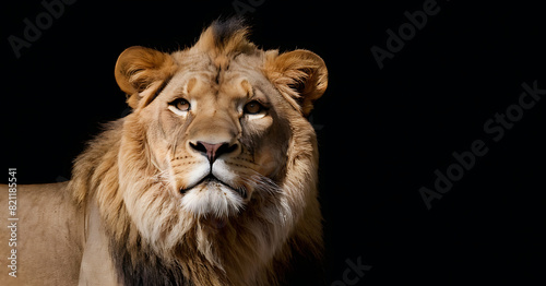 Fototapeta premium A majestic lion with a thick mane gazes intently into the distance against a black background